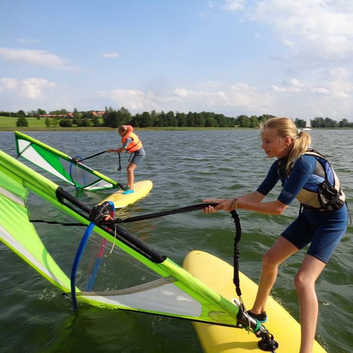 Nauka pływania na desce z żaglem. Na zajęciach opanujecie podstawy, jeśli jednak Wam się to spodoba, możecie wziąć udział w większej ilości zajęć windsurfingowych, aby bardzo dobrze opanować technikę (bez dopłat).